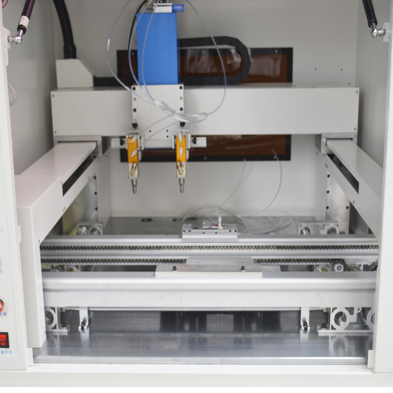 設備由3套五軸坐標機械手+2臺治具升降機構(gòu)+1臺治具停留平臺+6臺子母治具/產(chǎn)品移動平臺+1臺取料機械手+1臺出料流水線+1套底部回流線+3套供膠泵體組合而成。 3個膠頭同時作業(yè),產(chǎn)量成倍增長。 正常工作時每個點膠設備的前后都有產(chǎn)品待料,待三個點膠設備完成后,流水線同步動作。 流水線設置定位裝置,保證產(chǎn)品的快速移動和定位性,產(chǎn)品到位后氣缸頂起產(chǎn)品,翻轉(zhuǎn)軸夾緊產(chǎn)品實現(xiàn)翻板動作。