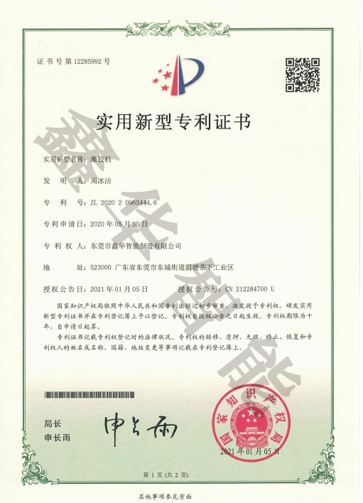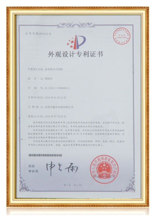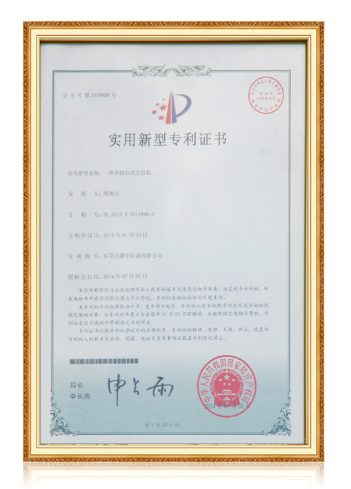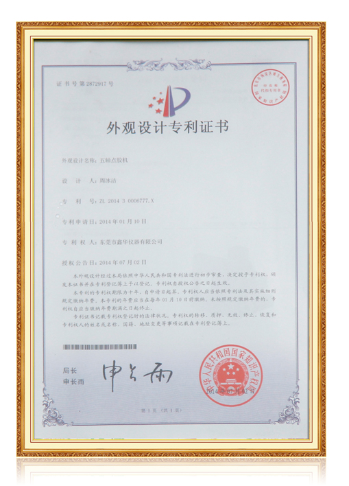 五軸點(diǎn)膠機(jī)專利證書(shū)