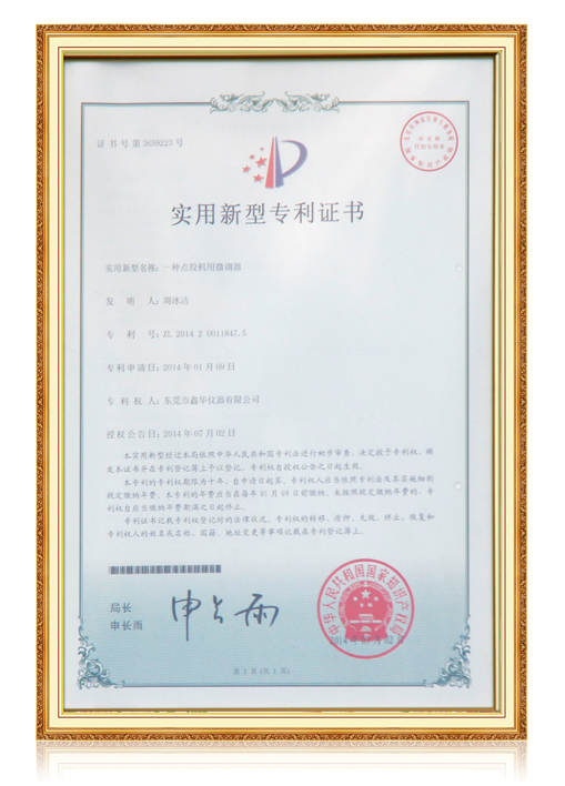 點(diǎn)膠機(jī)用微調(diào)器證書(shū)
