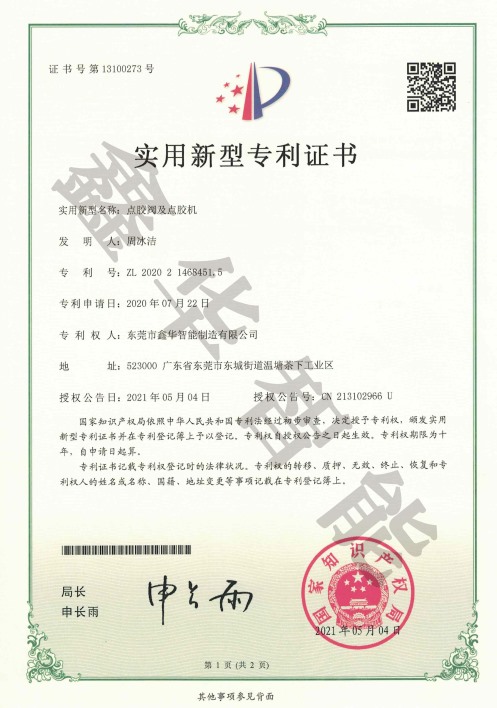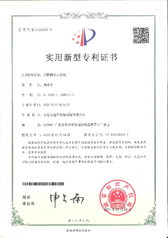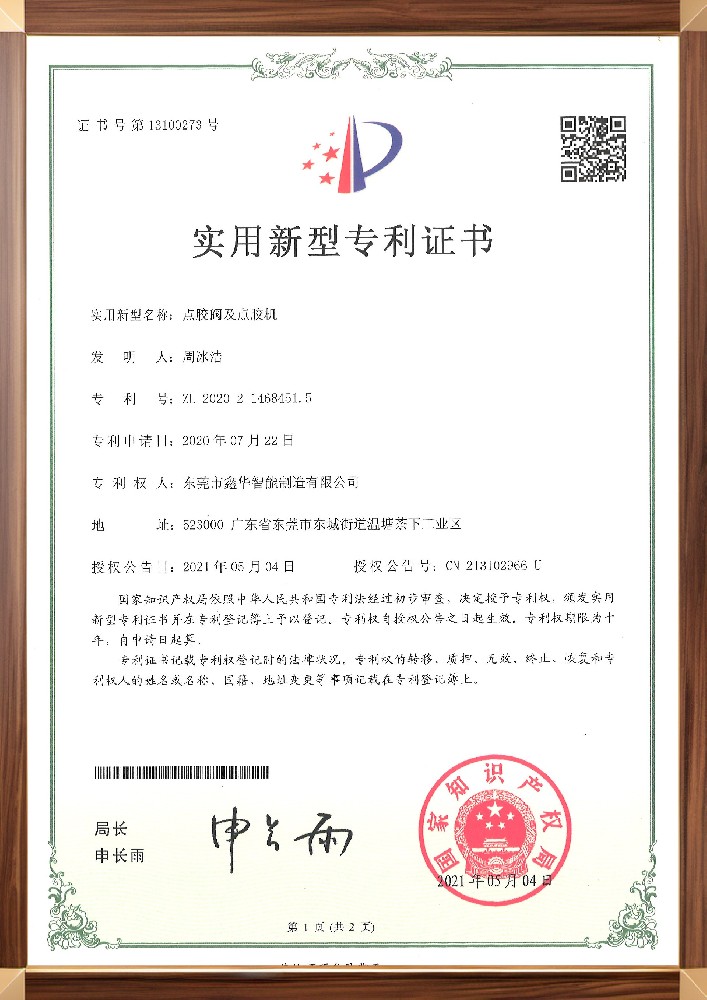 點(diǎn)膠閥及點(diǎn)膠機(jī)專利證書(shū)